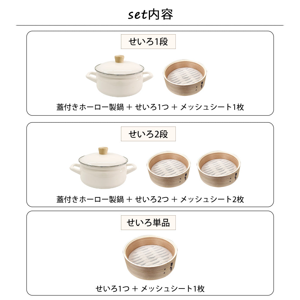 ホーロー製の両手鍋とせいろ、せいろ内に敷くシリコン製のメッシュシートのセット。